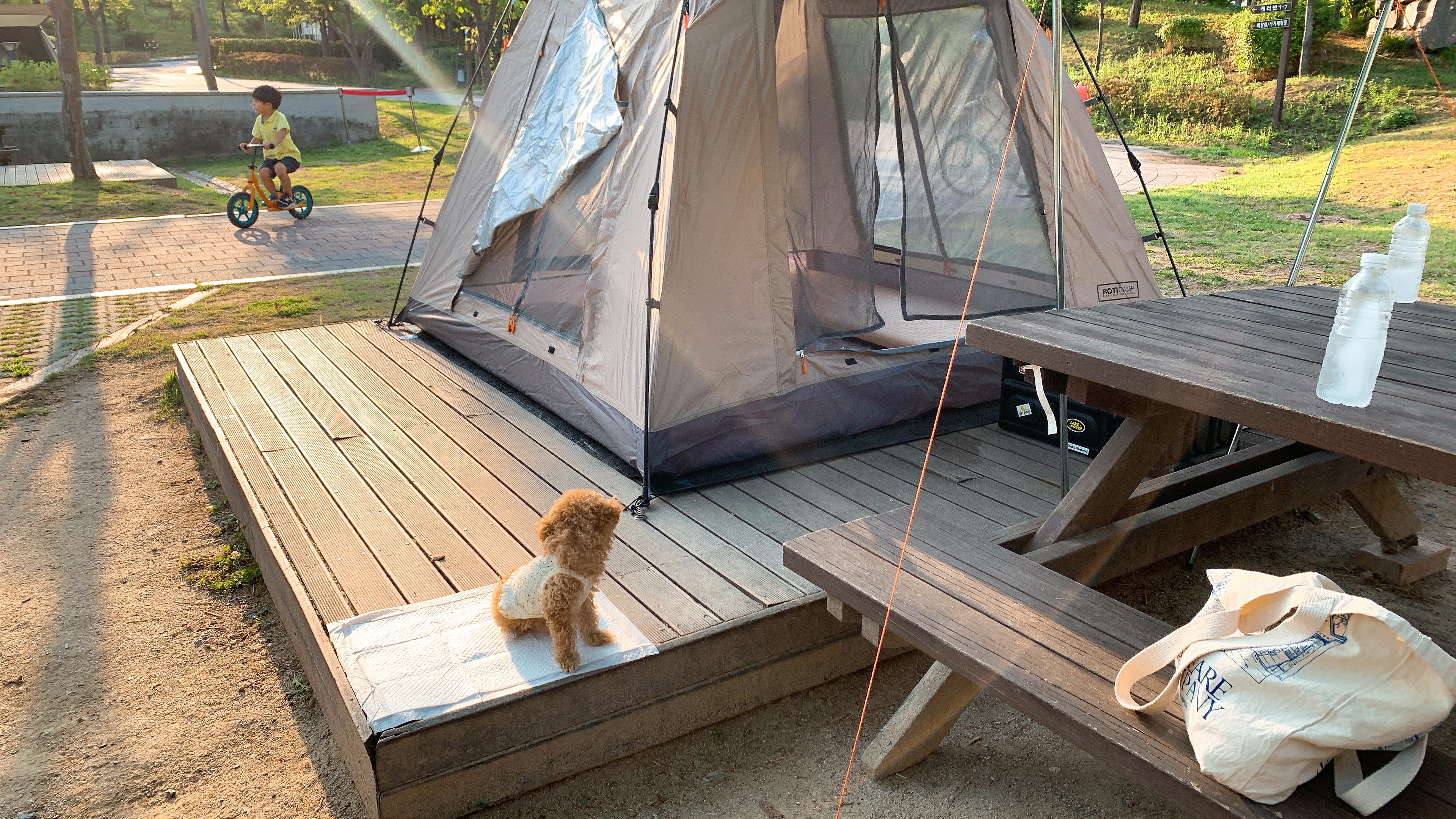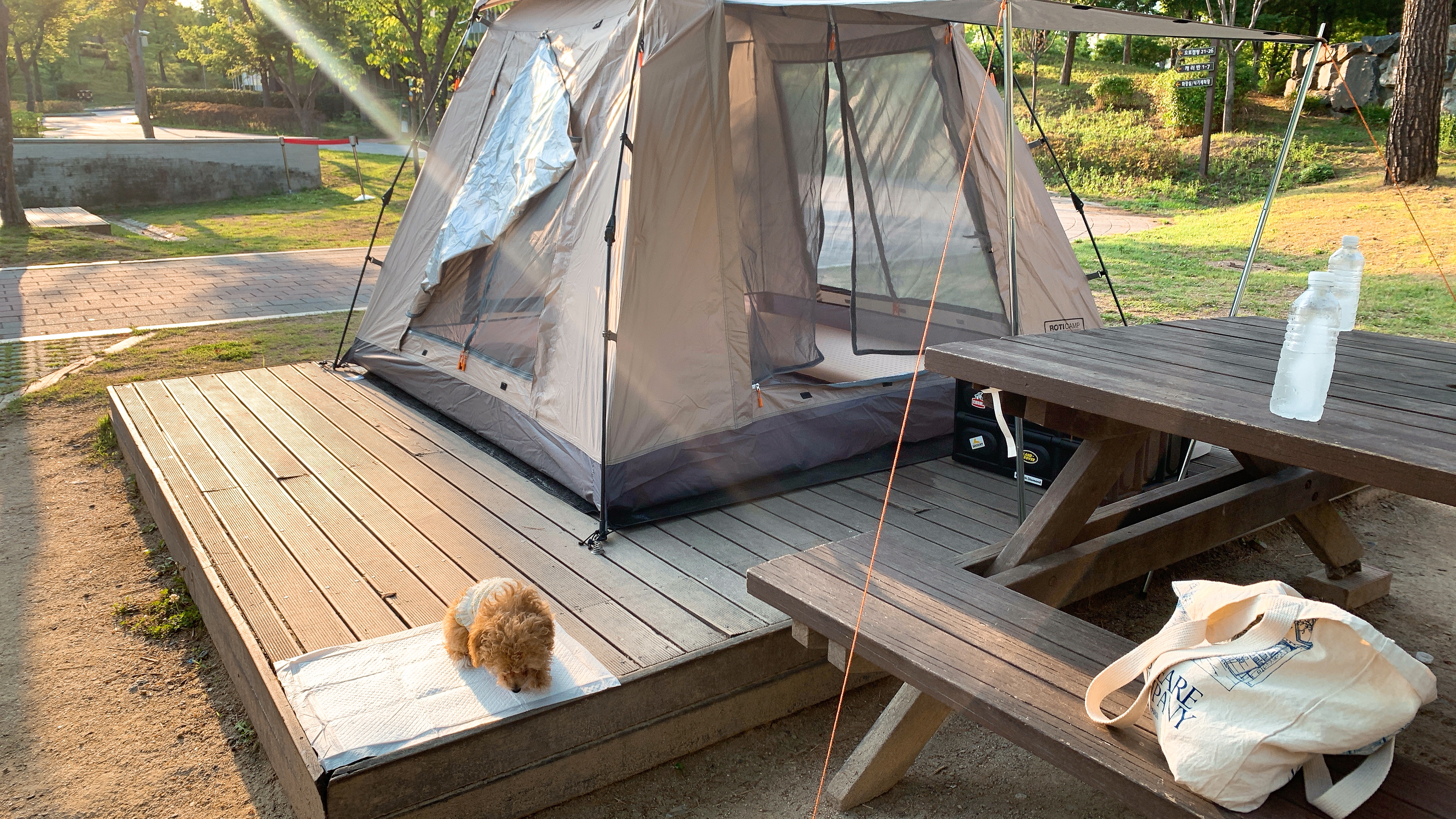 강아지도 같이 들어갈 수 있다. 텐트는 집에서 가져왔고, 빌린 자리에 테이블이 있어서 좋다.